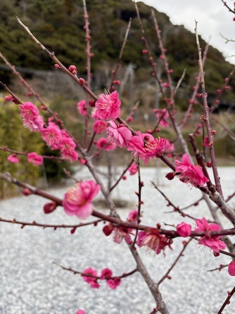 2月中旬、まだまだ寒い日が続きますが当館庭の梅の木にピンクと白の可憐な花が咲きはじめました。